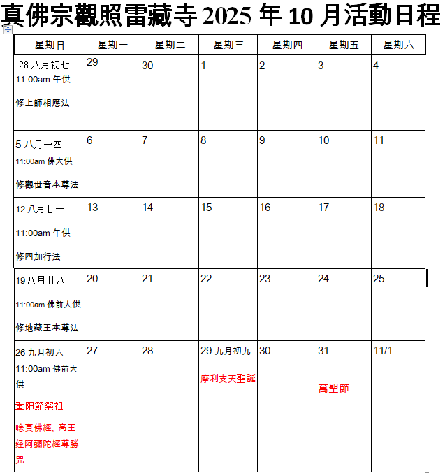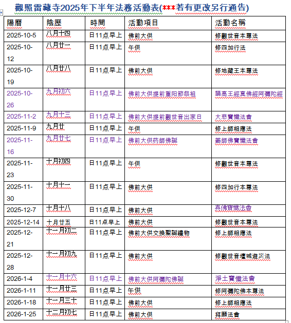 頂禮蓮生活佛盧勝彥 觀照雷藏寺 2025年 10月至2026年 1月 法務活動表