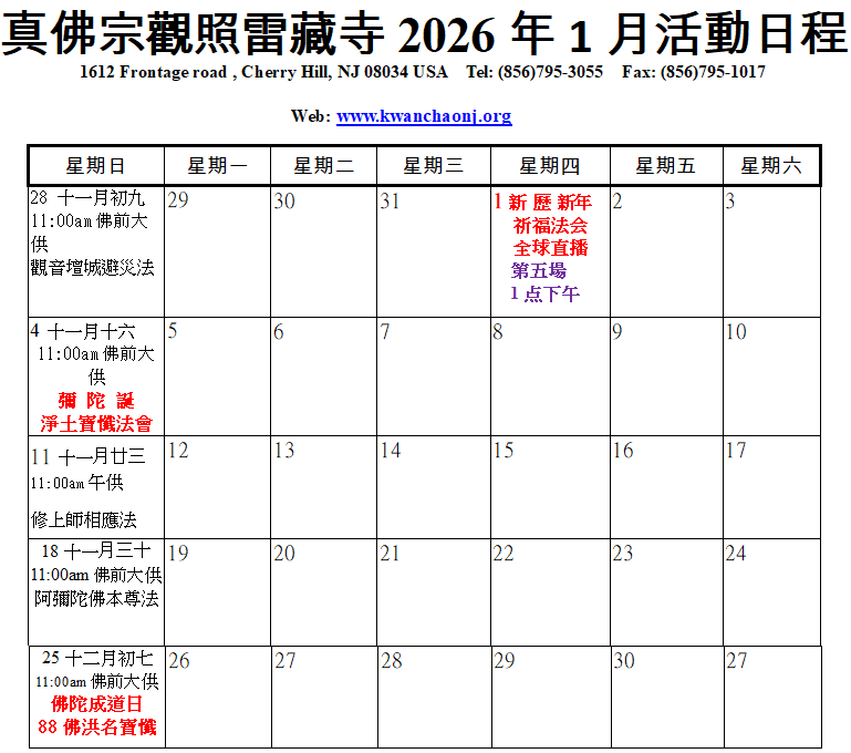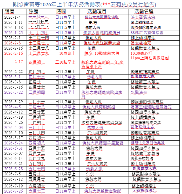 觀照雷藏寺 2026年 1月至2026年 7月 法務活動表
